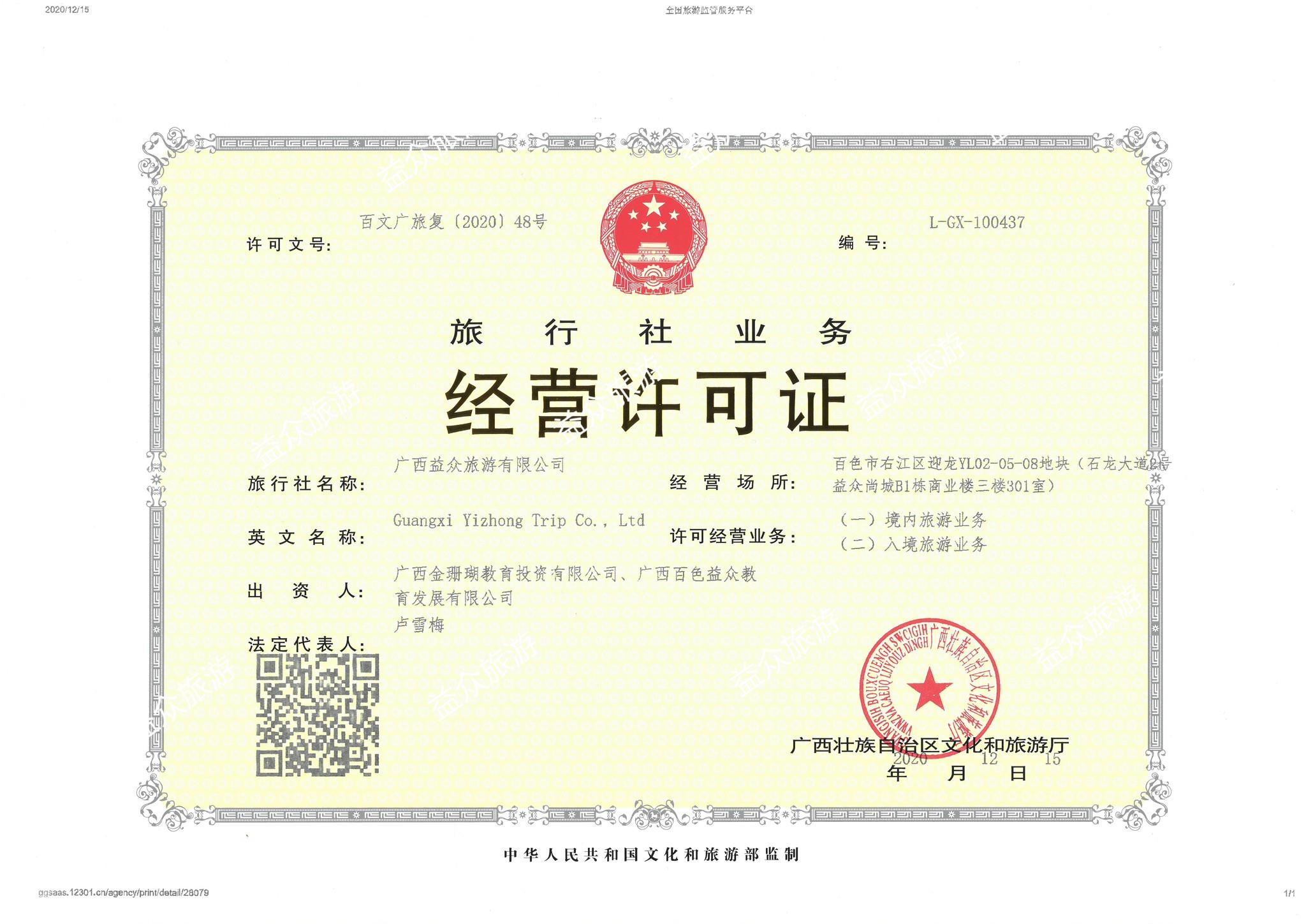????????12月15日,廣西益眾旅游有限公司通過(guò)廣西壯族自治區(qū)文化和旅游廳各項(xiàng)認(rèn)證,符合國(guó)家各項(xiàng)標(biāo)準(zhǔn)要求,獲得了旅行社業(yè)務(wù)經(jīng)營(yíng)許可證。