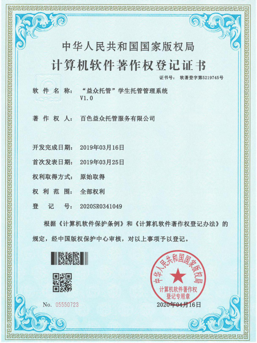 日前,經(jīng)中國(guó)版權(quán)保護(hù)中心審核,百色益眾托管服務(wù)有限公司提交的《“益眾托管”學(xué)生托管管理系統(tǒng)》符合《計(jì)算機(jī)軟件保護(hù)條例》和《計(jì)算機(jī)軟件著作權(quán)登記辦法》的相關(guān)規(guī)定,被認(rèn)定為原始取得,獲得國(guó)家版權(quán)局頒發(fā)《計(jì)算機(jī)軟件著作權(quán)登記證書》。