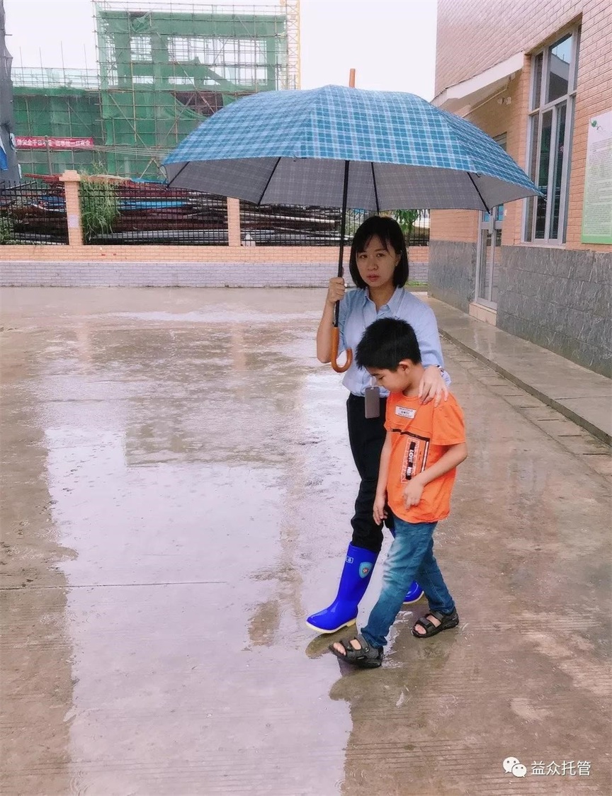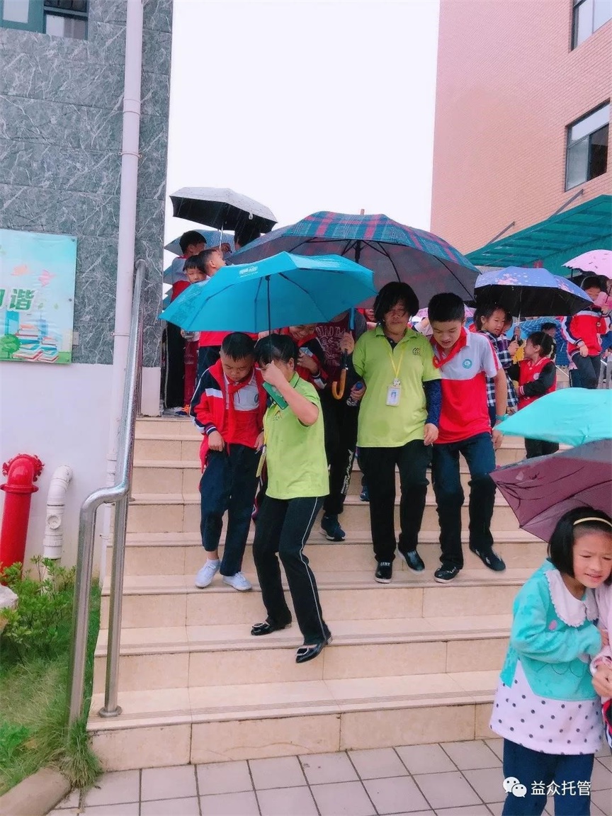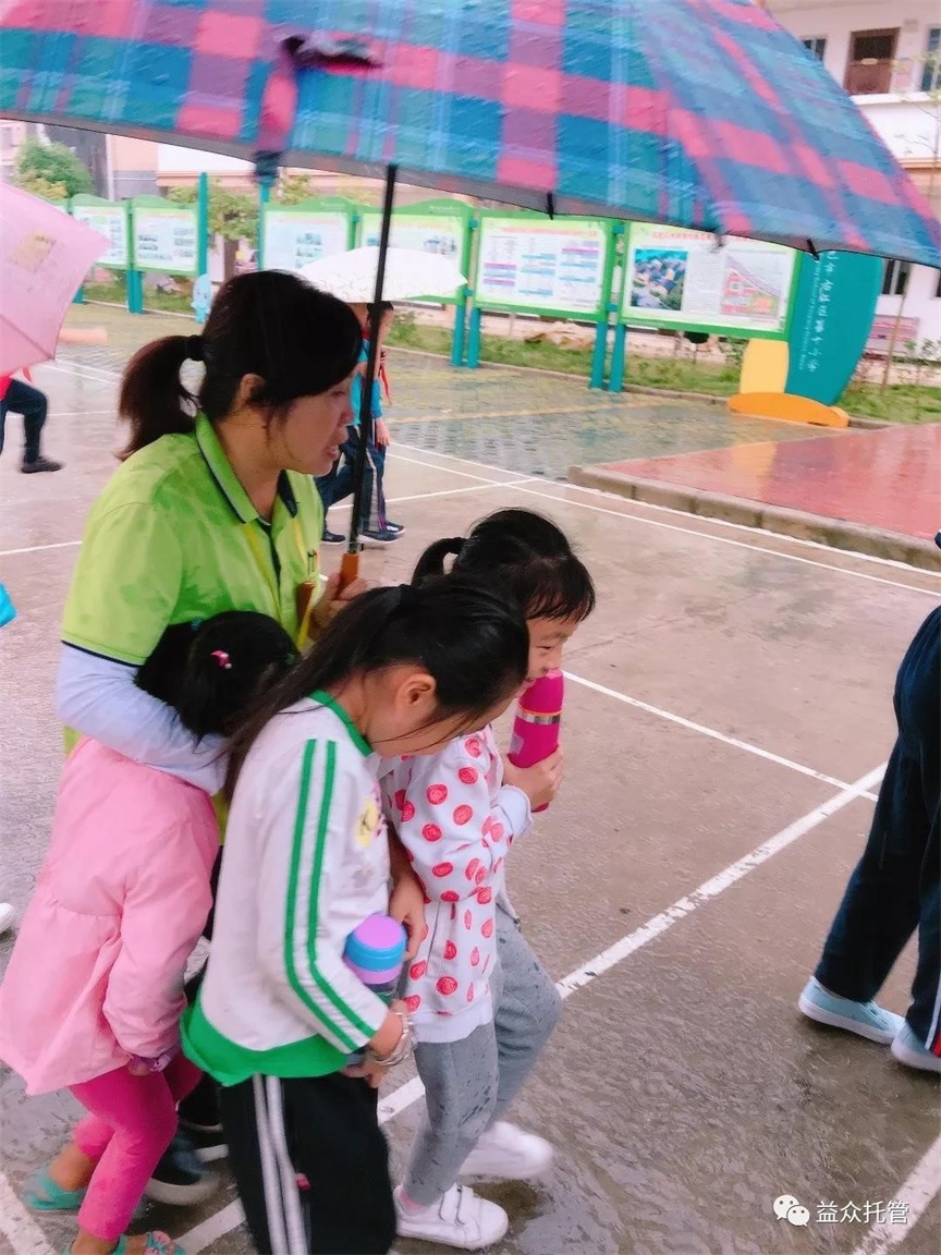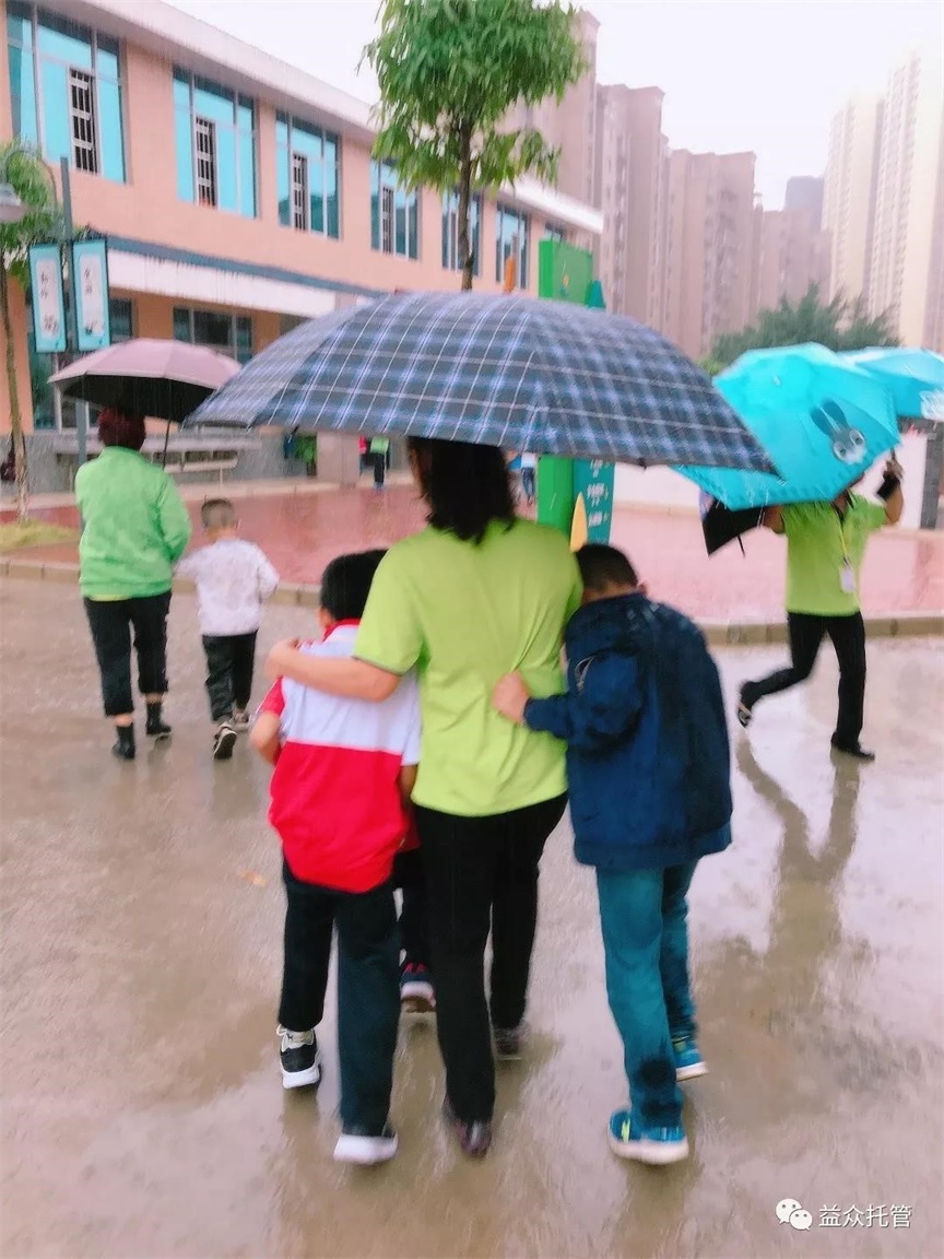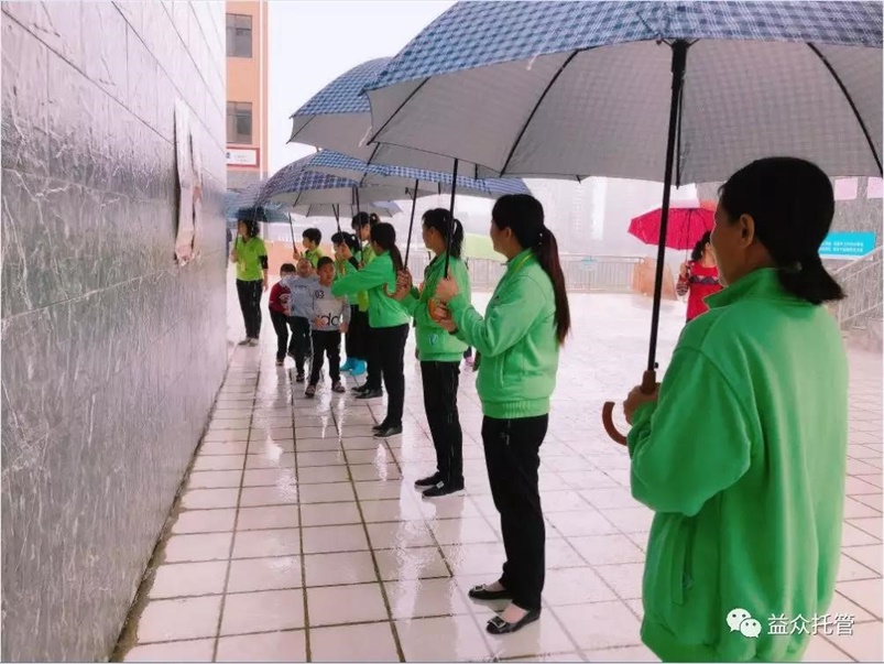 ??? 突如其來的大雨讓孩子們寸步難行,公司各校區(qū)第一時(shí)間啟動(dòng)雨天動(dòng)線方案。托管老師們撐起雨傘,從教室門口到食堂為孩子們構(gòu)筑了一條無雨通道,護(hù)送孩子們到食堂用餐,保障下雨期間的學(xué)生人身安全。