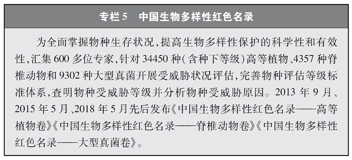 開(kāi)展全國(guó)生物多樣性調(diào)查與評(píng)估。大力推進(jìn)生物多樣性保護(hù)重大工程實(shí)施,結(jié)合自然資源調(diào)查、生態(tài)系統(tǒng)監(jiān)測(cè)評(píng)估等工作,不斷完善生物多樣性調(diào)查與評(píng)估能力,首次將生物多樣性指標(biāo)納入生態(tài)質(zhì)量綜合評(píng)價(jià)指標(biāo)體系,引導(dǎo)地方加強(qiáng)生態(tài)文明建設(shè)與生物多樣性保護(hù)。開(kāi)展自然資源調(diào)查,包括森林、草原、水、濕地、荒漠、海洋等,建立自然資源調(diào)查評(píng)價(jià)監(jiān)測(cè)制度。構(gòu)建了涵蓋2376個(gè)縣級(jí)行政單元、樣線總長(zhǎng)超過(guò)3.4萬(wàn)公里的物種分布數(shù)據(jù)庫(kù),建立物種資源調(diào)查及收集信息平臺(tái),準(zhǔn)確反映野生動(dòng)植物空間分布狀況。完成長(zhǎng)江經(jīng)濟(jì)帶、京津冀等國(guó)家戰(zhàn)略區(qū)域180多個(gè)縣級(jí)行政區(qū)生物多樣性調(diào)查與評(píng)估。組織開(kāi)展近海漁業(yè)資源調(diào)查,初步掌握近海漁業(yè)資源狀況。陸續(xù)發(fā)布《中國(guó)植物紅皮書》《中國(guó)瀕危動(dòng)物紅皮書》《中國(guó)物種紅色名錄》《中國(guó)生物多樣性紅色名錄》,基本掌握生物多樣性總體情況,為加強(qiáng)生物多樣性保護(hù)奠定了科學(xué)基礎(chǔ)。