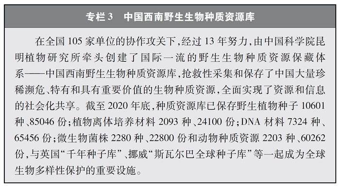 加快重要生物遺傳資源收集保存和利用。中國(guó)高度重視生物資源保護(hù),近年來(lái)在生物資源調(diào)查、收集、保存等方面取得較大進(jìn)展。實(shí)施戰(zhàn)略生物資源計(jì)劃專項(xiàng),完善生物資源收集收藏平臺(tái),建立種質(zhì)資源創(chuàng)新平臺(tái)、遺傳資源衍生庫(kù)和天然化合物轉(zhuǎn)化平臺(tái),持續(xù)加強(qiáng)野生生物資源保護(hù)和利用。實(shí)施一批種質(zhì)資源保護(hù)和育種創(chuàng)新項(xiàng)目,截至2020年底,形成了以國(guó)家作物種質(zhì)長(zhǎng)期庫(kù)及其復(fù)份庫(kù)為核心、10座中期庫(kù)與43個(gè)種質(zhì)圃為支撐的國(guó)家作物種質(zhì)資源保護(hù)體系,建立了199個(gè)國(guó)家級(jí)畜禽遺傳資源保種場(chǎng)(區(qū)、庫(kù)),為90%以上的國(guó)家級(jí)畜禽遺傳資源保護(hù)名錄品種建立了國(guó)家級(jí)保種單位,長(zhǎng)期保存作物種質(zhì)資源52萬(wàn)余份、畜禽遺傳資源96萬(wàn)份。建設(shè)99個(gè)國(guó)家級(jí)林木種質(zhì)資源保存庫(kù),以及新疆、山東2個(gè)國(guó)家級(jí)林草種質(zhì)資源設(shè)施保存庫(kù)國(guó)家分庫(kù),保存林木種質(zhì)資源4.7萬(wàn)份。建設(shè)31個(gè)藥用植物種質(zhì)資源保存圃和2個(gè)種質(zhì)資源庫(kù),保存種子種苗1.2萬(wàn)多份。