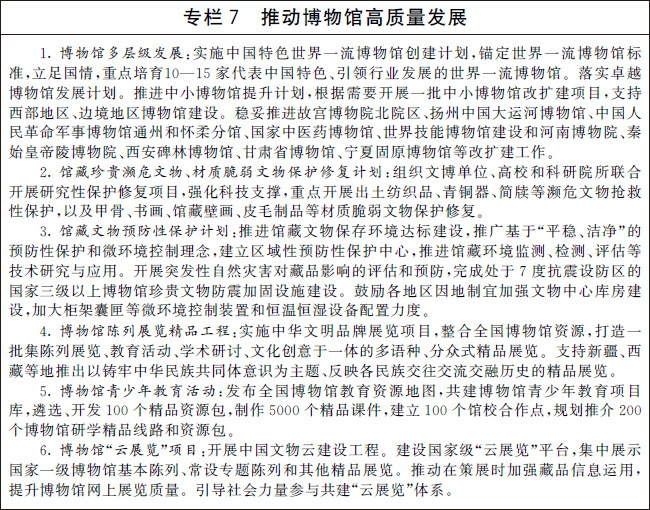 實(shí)施中國(guó)特色世界一流博物館創(chuàng)建計(jì)劃。支持省級(jí)、重要地市級(jí)博物館特色化發(fā)展。盤(pán)活基層博物館資源。探索建立行業(yè)博物館聯(lián)合認(rèn)證、共建共管機(jī)制。規(guī)范和扶持非國(guó)有博物館發(fā)展,落實(shí)支持政策,依法依規(guī)推進(jìn)非國(guó)有博物館法人財(cái)產(chǎn)權(quán)確權(quán)。認(rèn)真履行相關(guān)審批程序,有序推動(dòng)建設(shè)一批反映黨和國(guó)家建設(shè)成就的當(dāng)代主題博物館和行業(yè)博物館,重點(diǎn)支持建設(shè)反映中華文明發(fā)展歷程的國(guó)家級(jí)重點(diǎn)專題博物館,倡導(dǎo)建設(shè)特色專題博物館。探索在文化資源豐厚地區(qū)建設(shè)“博物館之城”。
