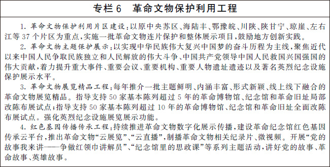 整合文物、黨史、軍史、檔案、地方志等方面研究力量,加強(qiáng)革命文物保護(hù)利用研究,開(kāi)展實(shí)物、文獻(xiàn)、檔案、史料和口述史征集,挖掘革命文物深刻內(nèi)涵,推出重要研究成果,旗幟鮮明反對(duì)和抵制歷史虛無(wú)主義,繼續(xù)發(fā)揚(yáng)偉大建黨精神,傳承弘揚(yáng)井岡山精神、長(zhǎng)征精神、遵義會(huì)議精神、延安精神、西柏坡精神、紅巖精神、抗美援朝精神、“兩彈一星”精神、特區(qū)精神、抗洪精神、抗震救災(zāi)精神、抗疫精神、脫貧攻堅(jiān)精神等偉大精神。