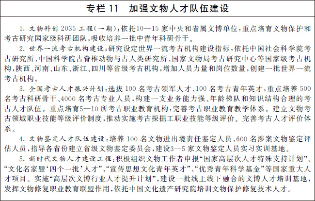 培育一批以領(lǐng)軍人才和中青年骨干創(chuàng)新人才為重點(diǎn)的高層次文物人才,加強(qiáng)考古、科技創(chuàng)新、文物鑒定、文物修復(fù)、文物展覽等急需領(lǐng)域人才培養(yǎng),加快建設(shè)一支門(mén)類齊全、技藝精湛的文物技能人才隊(duì)伍,穩(wěn)步造就一支科技研發(fā)能力和技術(shù)應(yīng)用能力過(guò)硬的文物科技人才隊(duì)伍,錘煉一支熟悉專業(yè)、素質(zhì)優(yōu)良的文物管理人才隊(duì)伍。加強(qiáng)相關(guān)行業(yè)文物保護(hù)人才培養(yǎng)。