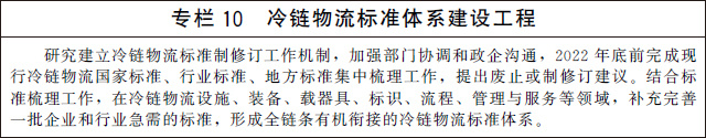 加強冷鏈物流標準制修訂。加強冷鏈基礎通用標準和冷鏈基礎設施、技術裝備、作業(yè)流程、信息追溯等重點環(huán)節(jié)以及冷鏈物流綠色化、智慧化等重點領域標準制修訂,加快填補標準空白。制定一批強制性國家標準,守好冷鏈產品安全底線。加強冷鏈物流推薦性國家標準、行業(yè)標準推陳出新,支持地方因地制宜制定符合發(fā)展需要的地方標準,鼓勵高起點制定團體標準和企業(yè)標準。積極參與冷鏈物流國際標準化活動,推動國內國際標準接軌。