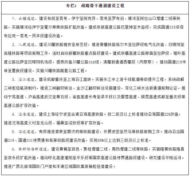 加強(qiáng)戰(zhàn)略骨干通道建設(shè)。推進(jìn)出疆入藏通道建設(shè),擴(kuò)大甘新、青新、青藏、川藏四條內(nèi)聯(lián)主通道通行能力,穩(wěn)步推進(jìn)川藏鐵路建設(shè),加快推進(jìn)新藏鐵路和田至日喀則段前期工作、適時(shí)啟動重點(diǎn)路段建設(shè),有序推進(jìn)滇藏鐵路前期工作,密實(shí)優(yōu)化航空航線網(wǎng)絡(luò)布局,構(gòu)建多向聯(lián)通的通道布局。暢通沿江通道,加快建設(shè)沿江高鐵,優(yōu)化以高等級航道和干線鐵路、高速公路為骨干的沿江綜合運(yùn)輸大通道功能。升級沿海通道,提高鐵路通道能力,推進(jìn)高速公路繁忙路段擴(kuò)容改造,提升港口航道整體效能,構(gòu)建大容量、高品質(zhì)的運(yùn)輸走廊。貫通沿邊通道,提級改造普通國省干線,推進(jìn)重點(diǎn)方向沿邊鐵路建設(shè),提高安全保障水平。建設(shè)西部陸海新通道,發(fā)揮鐵路在陸路運(yùn)輸中的骨干作用和港口在海上運(yùn)輸中的門戶作用,強(qiáng)化東、中、西三條通路,形成大能力主通道,銜接國際運(yùn)輸通道。