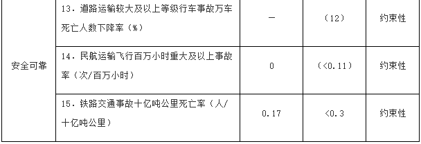 注:①〔〕內(nèi)為5年累計(jì)數(shù)。②指納入國家批準(zhǔn)的城市軌道交通建設(shè)規(guī)劃中的大中運(yùn)量城市軌道交通項(xiàng)目。③指國際樞紐機(jī)場和區(qū)域樞紐機(jī)場中連通軌道交通的機(jī)場數(shù)量占比。④指重點(diǎn)營運(yùn)車輛、郵政快遞自有干線運(yùn)輸車輛、應(yīng)安裝具備衛(wèi)星定位功能船載設(shè)備的客船及危險(xiǎn)品船等。⑤指新能源公交車輛占所有地面公交車輛的比重。⑥指按單位運(yùn)輸周轉(zhuǎn)量計(jì)算的二氧化碳排放。