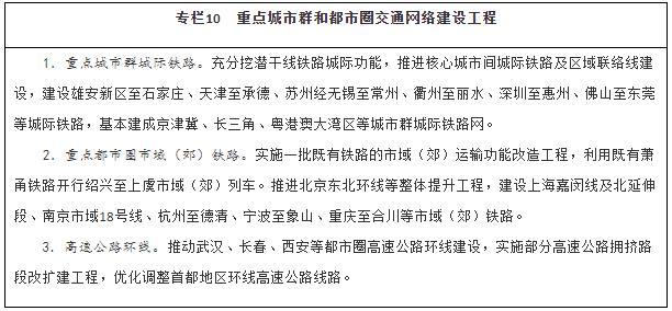 強(qiáng)化重點(diǎn)城市群城際交通建設(shè)。圍繞京津冀、長三角、粵港澳大灣區(qū)、成渝、長江中游等城市群,以軌道交通、高速公路為骨干,提升城際運(yùn)輸通道功能,加強(qiáng)核心城市快速直連,構(gòu)建多節(jié)點(diǎn)、網(wǎng)絡(luò)化的城際交通網(wǎng),實(shí)現(xiàn)城市群內(nèi)主要城市間2小時(shí)通達(dá)。整體推進(jìn)京津冀、長三角、粵港澳大灣區(qū)城際鐵路和市域(郊)鐵路建設(shè),有序推動成渝地區(qū)雙城經(jīng)濟(jì)圈城際鐵路和市域(郊)鐵路建設(shè),加強(qiáng)與高速鐵路、普速鐵路一體銜接,擴(kuò)大對5萬人口以上城鎮(zhèn)的有效覆蓋。