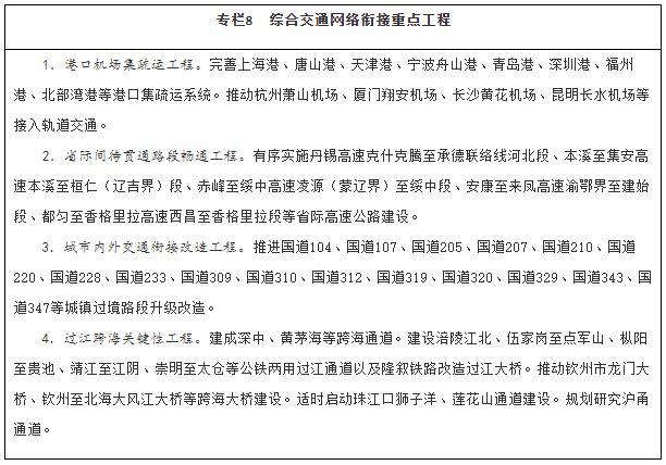 加快解決制約人民美好出行、貨物高效流通的瓶頸,強(qiáng)化綜合交通網(wǎng)絡(luò)有機(jī)銜接。打通公路省際待貫通路段,加強(qiáng)干線公路與城市道路有效銜接,推進(jìn)城鎮(zhèn)密集地區(qū)干線公路過境段、進(jìn)出城瓶頸路段升級改造。加強(qiáng)樞紐機(jī)場與軌道交通高效銜接,使換乘更加便捷。強(qiáng)化進(jìn)港區(qū)、進(jìn)園區(qū)、進(jìn)廠區(qū)、進(jìn)規(guī)模化農(nóng)產(chǎn)品基地等集疏運(yùn)設(shè)施建設(shè),加快推動鐵路進(jìn)港口重點(diǎn)港區(qū)和大型工礦企業(yè)、物流園區(qū)、重點(diǎn)物資儲備庫。統(tǒng)籌考慮資源高效利用、生態(tài)環(huán)境保護(hù)和防洪航運(yùn)安全,有序建設(shè)各種運(yùn)輸方式共享通道資源的過江跨海通道。推動超大特大城市的大型綜合客運(yùn)樞紐間通過軌道交通互連。加快實(shí)現(xiàn)聯(lián)系緊密的綜合貨運(yùn)樞紐間通過聯(lián)絡(luò)線或?qū)S猛ǖ阑ミB。