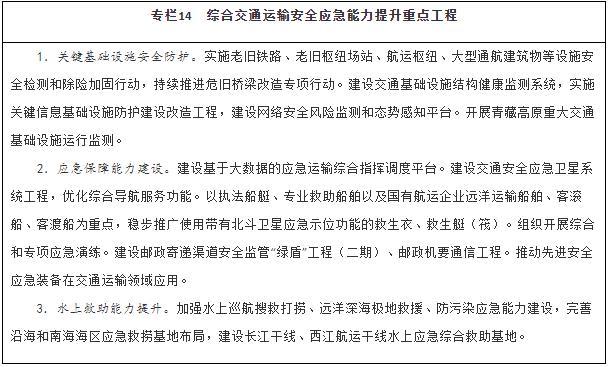 健全綜合交通運(yùn)輸應(yīng)急管理體制機(jī)制,完善應(yīng)急協(xié)調(diào)機(jī)制和應(yīng)急預(yù)案體系,加強(qiáng)交通運(yùn)輸調(diào)度與應(yīng)急指揮平臺建設(shè)。推進(jìn)區(qū)域性公路應(yīng)急裝備物資儲備中心建設(shè)。加強(qiáng)水上交通安全監(jiān)管、航海保障和救助打撈能力建設(shè),完善沿海和內(nèi)河溢油應(yīng)急設(shè)備庫,構(gòu)建陸??仗煲惑w化水上交通運(yùn)輸安全保障體系。建設(shè)城市軌道交通應(yīng)急演練中心。以骨干航空物流企業(yè)為主體構(gòu)建航空應(yīng)急服務(wù)網(wǎng)絡(luò)。建設(shè)海事監(jiān)管指揮系統(tǒng)。在開展城市交通基礎(chǔ)設(shè)施地下空間、低洼區(qū)域、重點(diǎn)區(qū)段、重要點(diǎn)位、關(guān)鍵設(shè)施等隱患排查基礎(chǔ)上,建立健全風(fēng)險(xiǎn)臺賬和災(zāi)害隱患清單,補(bǔ)齊設(shè)施設(shè)備、應(yīng)急搶險(xiǎn)物資等短板,持續(xù)完善應(yīng)急處置預(yù)案,健全應(yīng)急響應(yīng)機(jī)制,提升應(yīng)對極端天氣能力。加強(qiáng)應(yīng)急專業(yè)隊(duì)伍和志愿者隊(duì)伍建設(shè),充實(shí)國家應(yīng)急運(yùn)輸儲備力量。健全應(yīng)對重大疫情、防范應(yīng)對恐怖襲擊、保障信息安全等非傳統(tǒng)安全應(yīng)急指揮體系和應(yīng)急交通組織。