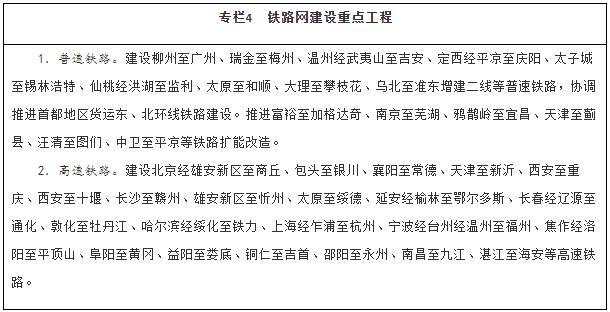 建設(shè)現(xiàn)代化鐵路網(wǎng)。堅(jiān)持客貨并重、新建改建并舉、高速普速協(xié)調(diào)發(fā)展,加快普速鐵路建設(shè)和既有鐵路擴(kuò)能改造,著力消除干線瓶頸,推進(jìn)既有鐵路運(yùn)能緊張路段能力補(bǔ)強(qiáng),加快提高中西部地區(qū)鐵路網(wǎng)覆蓋水平。加強(qiáng)資源富集區(qū)、人口相對密集脫貧地區(qū)的開發(fā)性鐵路和支線鐵路建設(shè)。推進(jìn)高速鐵路主通道建設(shè),提升沿江、沿海、呼南、京昆等重要通道以及京滬高鐵輔助通道運(yùn)輸能力,有序建設(shè)區(qū)域連接線。綜合運(yùn)用新技術(shù)手段,改革創(chuàng)新經(jīng)營管理模式,提高鐵路網(wǎng)整體運(yùn)營效率。統(tǒng)籌考慮運(yùn)輸需求和效益,合理規(guī)劃建設(shè)鐵路項(xiàng)目,嚴(yán)控高速鐵路平行線路建設(shè)。