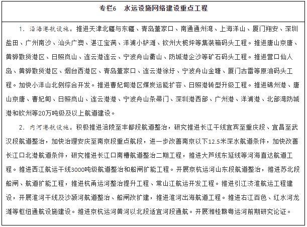 優(yōu)化暢通水運(yùn)設(shè)施網(wǎng)絡(luò)。建設(shè)京津冀、長三角、粵港澳大灣區(qū)世界級港口群,支持山東打造世界一流的海洋港口,推進(jìn)東北地區(qū)沿海港口一體化發(fā)展,優(yōu)化港口功能布局,推動資源整合和共享共用。有序推進(jìn)沿海港口專業(yè)化碼頭及進(jìn)出港航道等公共設(shè)施建設(shè)。適度超前建設(shè)糧食、能源、礦產(chǎn)資源的接卸、儲存、中轉(zhuǎn)設(shè)施,推進(jìn)沿海沿江液化天然氣碼頭規(guī)劃建設(shè)。提升內(nèi)河港口專業(yè)化、規(guī)?;?,合理集中布局集裝箱、煤炭、鐵礦石、商品汽車等專業(yè)化碼頭。加強(qiáng)內(nèi)河高等級航道擴(kuò)能升級與暢通攻堅(jiān)建設(shè),完善長江、珠江、京杭運(yùn)河和淮河等水系內(nèi)河高等級航道網(wǎng)絡(luò),進(jìn)一步提升珠三角高等級航道網(wǎng)出海能力,全面加強(qiáng)長三角、珠江—西江高等級航道網(wǎng)未達(dá)標(biāo)段建設(shè)。推動重要支流航道和庫湖區(qū)航道、內(nèi)河旅游航道、便民碼頭建設(shè)。