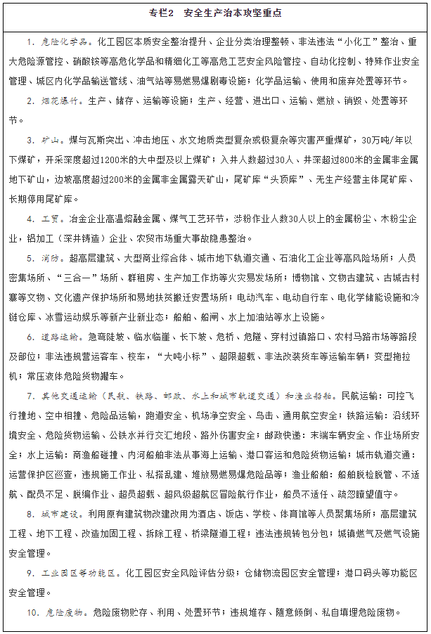 深化專項整治。深入推進危險化學品、礦山、消防、交通運輸、建筑施工、民爆、特種設備、大型商業(yè)綜合體等重點行業(yè)領域安全整治,解決影響制約安全生產(chǎn)的薄弱環(huán)節(jié)和突出問題,督促企業(yè)嚴格安全管理、加大安全投入、落實風險管控措施。結合深化供給側結構性改革,推動安全基礎薄弱、安全保障能力低下且整改后仍不達標的企業(yè)退出市場。統(tǒng)籌考慮危險化學品企業(yè)搬遷和項目建設審批,優(yōu)先保障符合條件企業(yè)的搬遷用地。持續(xù)推進企業(yè)安全生產(chǎn)標準化建設,實現(xiàn)安全管理、操作行為、設施設備和作業(yè)環(huán)境規(guī)范化。推動淘汰落后技術、工藝、材料和設備,加大重點設施設備、儀器儀表檢驗檢測力度。推動各類金融機構出臺優(yōu)惠貸款等金融類產(chǎn)品,大力推廣新技術、新工藝、新材料和新裝備,實施智能化礦山、智能化工廠、數(shù)字化車間改造,開展智能化作業(yè)和危險崗位機器人替代示范。強化危險廢物全過程監(jiān)管,動態(tài)修訂《國家危險廢物名錄》,修訂危險廢物鑒別、貯存以及水泥窯協(xié)同處置污染控制等標準,制定完善危險廢物重點監(jiān)管單位清單。建立廢棄危險化學品等危險廢物監(jiān)管協(xié)作和聯(lián)合執(zhí)法工作機制,加強危險廢物監(jiān)管能力與應急處置技術支持能力建設。