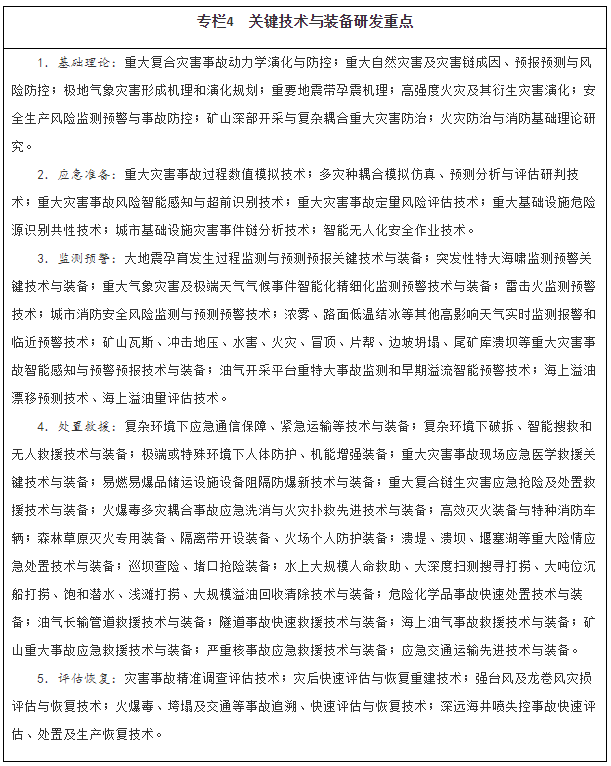 深化應用基礎研究。聚焦災害事故防控基礎問題,強化多學科交叉理論研究。開展重大自然災害科學考察與調查。整合利用中央和地方政府、企業(yè)以及其他優(yōu)勢科技資源,加強自主創(chuàng)新和“卡脖子”技術攻關。實施重大災害事故防治、重大基礎設施防災風險評估等國家科技計劃項目,制定國家重大應急關鍵技術攻關指南,加快主動預防型安全技術研究。