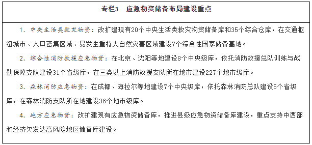 加強物資實物儲備。完善中央、省、市、縣、鄉(xiāng)五級物資儲備布局,建立健全包括重要民生商品在內的應急物資儲備目錄清單,合理確定儲備品類、規(guī)模和結構并動態(tài)調整。建立完善應急物資更新輪換機制。擴大人口密集區(qū)域、災害事故高風險區(qū)域和交通不便區(qū)域的應急物資儲備規(guī)模,豐富儲備物資品種、完善儲備倉庫布局,重點滿足流域大洪水、超強臺風以及特別重大山洪災害應急的物資需要。支持政企共建或委托企業(yè)代建應急物資儲備庫。