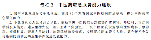 加強中醫(yī)藥應(yīng)急救治能力建設(shè)。依托高水平三級甲等中醫(yī)醫(yī)院,建設(shè)覆蓋所有省份的國家中醫(yī)疫病防治基地,依托基地組建中醫(yī)疫病防治隊伍,提升中醫(yī)緊急醫(yī)學(xué)救援能力。三級公立中醫(yī)醫(yī)院和中西醫(yī)結(jié)合醫(yī)院(不含中醫(yī)??漆t(yī)院)全部設(shè)置發(fā)熱門診,加強感染性疾病、急診、重癥、呼吸、檢驗等相關(guān)科室建設(shè),提升服務(wù)能力。