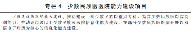 3.發(fā)展少數(shù)民族醫(yī)藥。加強少數(shù)民族醫(yī)醫(yī)療機構(gòu)建設(shè),提高民族地區(qū)基層醫(yī)療衛(wèi)生機構(gòu)少數(shù)民族醫(yī)藥服務(wù)能力。改善少數(shù)民族醫(yī)醫(yī)院基礎(chǔ)設(shè)施條件,加強少數(shù)民族醫(yī)醫(yī)院??颇芰?、制劑能力和信息化能力建設(shè)。建立符合少數(shù)民族醫(yī)醫(yī)療機構(gòu)自身特點和發(fā)展規(guī)律的績效評價指標體系。加大少數(shù)民族醫(yī)藥防治重大疾病和優(yōu)勢病種研究力度,有效傳承特色診療技術(shù)和方法。鼓勵和扶持少數(shù)民族醫(yī)藥院校教育、師承教育和繼續(xù)教育。加大對少數(shù)民族醫(yī)藥的傳承保護力度,持續(xù)開展少數(shù)民族醫(yī)藥文獻搶救整理工作,推動理論創(chuàng)新和技術(shù)創(chuàng)新。